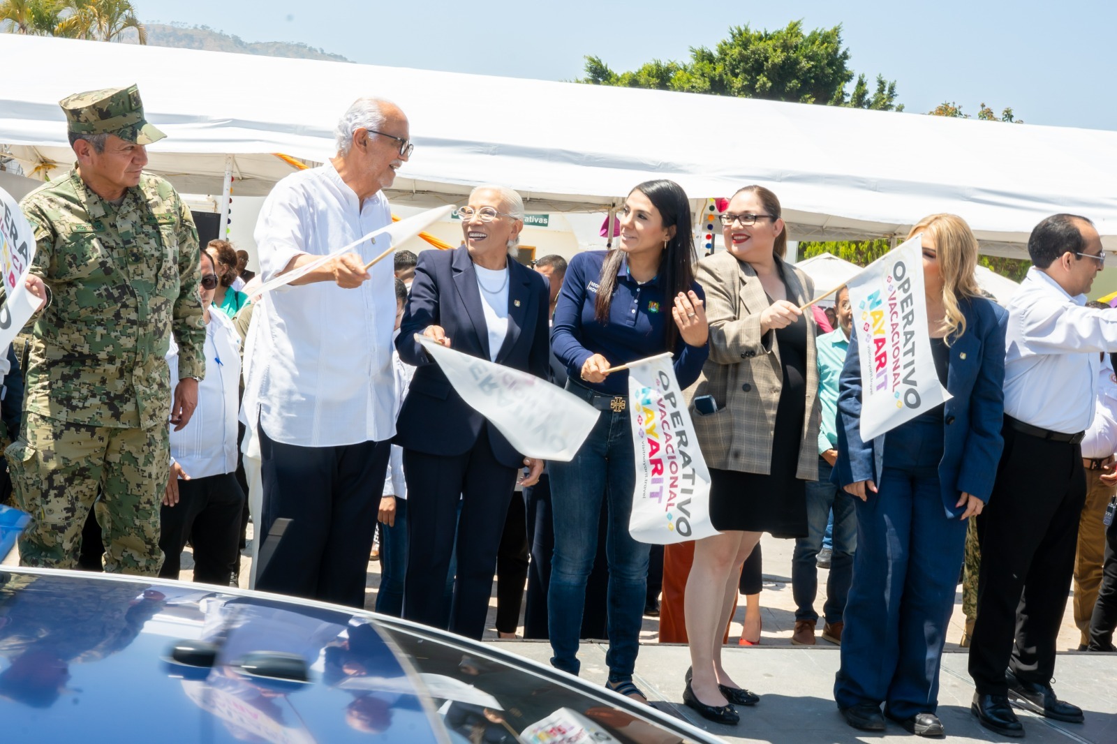 El gobernador de Nayarit, Miguel Ángel Navarro Quintero, dio el banderazo de inicio del Operativo Vacacional Semana Santa 2026 en la explanada del Exconvento de la Cruz, en Tepic, acompañado de su esposa, la doctora Beatriz Estrada Martínez, presidenta del Sistema DIF Nayarit, así como de autoridades de los tres órdenes de gobierno.